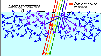 Seiring dengan perjalanan cahaya matahari melintasi atmosfer,cahaya matahari menabrak butiran air,kristal es,atau partikel debu dan polusi. Kesemuanya itu membuat cahaya pecah dan menyebar sehingga warna yang terkandung di dalam cahaya matahari memiliki sifat tertentu. Warna biru dalam cahaya matahari paling tersebar,sehingga pada hari yang cerah dan hangat langit terlihat biru terang.Mengapa Langit di Sore Hari Berwarna Merah?